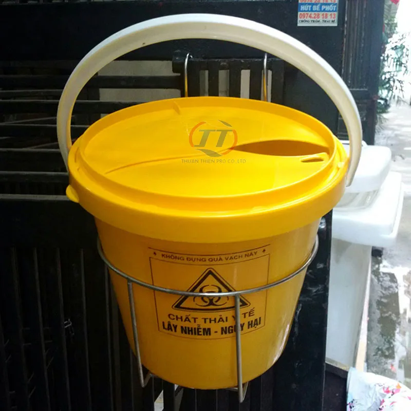Xô đựng rác thải y tế có đặc tính nắp xoay tiện dụng nên thường được sử dụng kèm hoặc treo trên xe tiêm trong quá trình khám chữa bệnh.