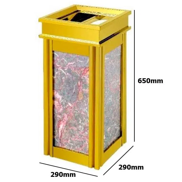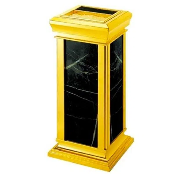 Thùng rác gạt tàn này mang đến thiết kế vô cùng đẳng cấp, sang trọng với những đường nét hài hòa, ấn tượng. Sự kết hợp tinh tế của đá hoa cương đen vân đỏ và khung inox mạ vàng rất phù hợp cho không gian tại sảnh khách sạn hay sảnh công ty.