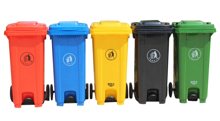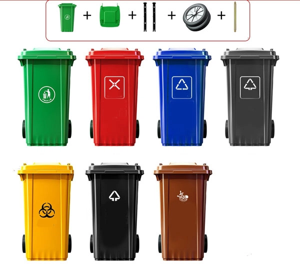 Thùng rác 120 lít có nhiều màu sắc khác nhau như xanh lá cây, xanh dương, đỏ, đen, xám, vàng, vv.
