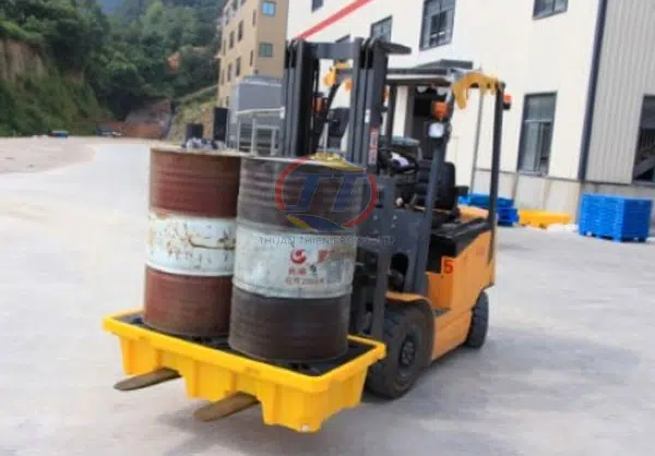 Pallet chống tràn dầu có công dụng duy trì môi trường làm việc an toàn, hiệu quả và hạn chế tình trạng tràn dầu xuống sàn làm hư hỏng và mất vệ sinh. Các thùng phi sẽ được nâng lên pallet để cố định và di chuyển đến nơi cần thiết. Tuy nhiên, nhiều người vẫn không biết làm thế nào để nâng thùng phi sắt với trọng lượng lớn lên pallet chống tràn. Đó là lý do Thuận Thiên Plastic sẽ bật mí các thực hiện ngay dưới đây.