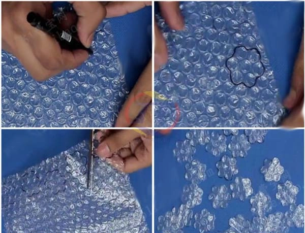Bước 1: Dùng bút dạ vẽ hình bông hoa lên mặt của xốp hơi chống sốc, lưu ý chúng ta phải giữ lại hình dạng của bong bóng để tạo hình bông hoa rồi cắt chúng ra.