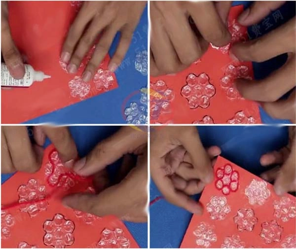 Bước 5: Ghép 6 bông hoa bọc xốp hơi màu đỏ xung quanh hoa màu vàng. Dùng súng bắt keo gắn chúng lại với nhau ở mặt sau. Để giúp hoa cứng cáp, bạn có thể cắm tăm hoặc que diêm vào giữa những bông hoa.