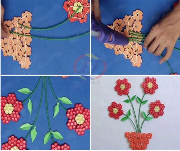 Bước 7: Dùng len xanh quấn quanh dây kẽm, sau đó dùng keo gắn vào phía sau bông hoa, dán lá vào thân, cuối cùng cố định chúng vào bồn hoa làm bằng màng xốp túi khí