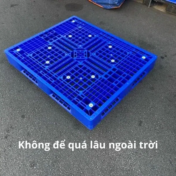 Không nên để pallet nhựa ngoài trời trong một thời gian dài bởi ánh nắng mặt trời sẽ làm tuổi thọ sản phẩm giảm đi nhanh chóng, nhựa dễ bay màu, trở nên giòn và dễ gãy hơn. Nếu phải để ngoài trời, nên để ở nơi có mái che và bọc sản phẩm bằng nilon hay màng bọc để hạn chế những yếu tố bụi bẩn, ẩm mốc.