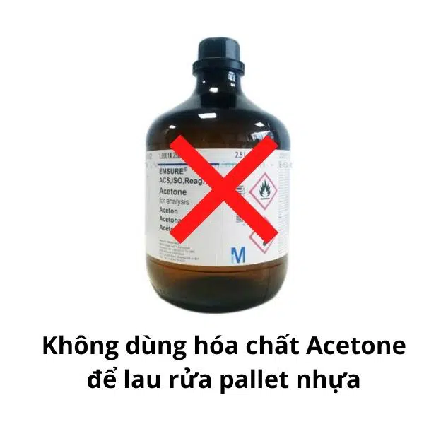 Tuyệt đối không dùng các loại hóa chất Acetone để lau rửa pallet nhựa. Chất này sẽ khiến cấu trúc nhựa bị phá vỡ và tan chảy, đồng thời chúng cũng dễ bắt lửa và độc hại vô cùng cho sức khỏe con người.