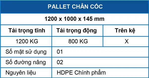 Nhìn vào thông số trên có thể thấy Pallet nhựa chân cốc có kích thước khá to. Tải trọng nâng nghĩa là khối lượng hàng hóa có thể đặt lên pallet khi di chuyển đạt mức 600kg. Và tải trọng tĩnh là khối lượng hàng hóa đặt cố định trên mặt đất, không di chuyển lên tới 1500kg.