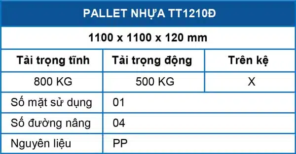 - Kích thước: Pallet xuất khẩu TT 1210Đ có kích thước các chiều dài, rộng, cao lần lượt là 1100 x 1100 x H120mm. Kích thước này phù hợp để vận chuyển nhiều loại hàng hóa, sản phẩm khi được chứa đựng trong thùng giấy lẫn bao tải cũng như nhiều loại xe nâng.
