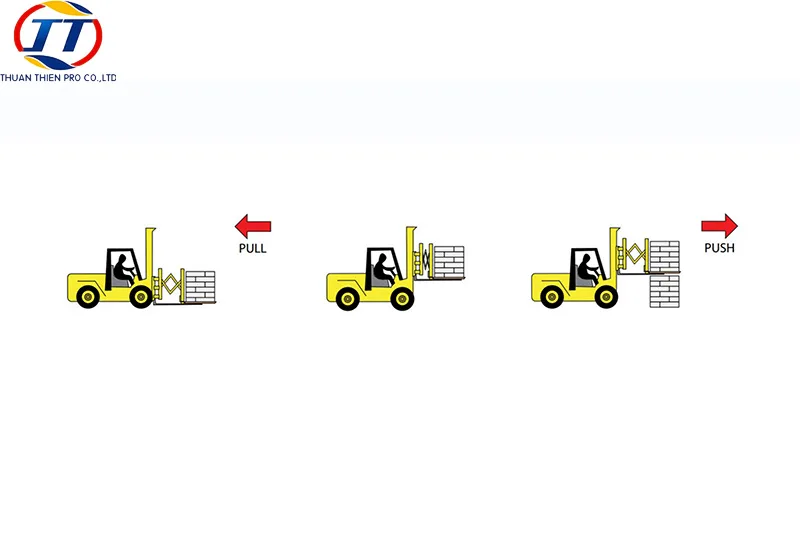 Slip Sheet hoạt động dựa trên nguyên lý đơn giản: Hàng hóa được đặt lên trên tấm Slip Sheet, sau đó sử dụng thiết bị kéo đẩy (pull-push attachment) gắn trên xe nâng để di chuyển hàng hóa.