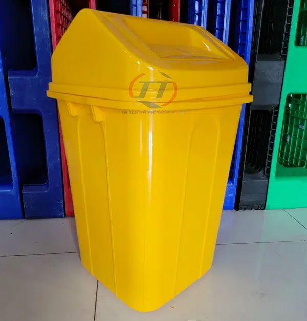 Đây là mẫu thùng rác nắp lật đại có dung tích 60 lít, được làm từ nhựa PP và có 2 màu xanh lá cây, vàng để khách hàng lựa chọn. Mẫu thùng rác này được cấu tạo gồm thân thùng rác có kích thước lớn kết hợp với nắp lật tiện lợi nên quý khách dễ dàng bỏ rác vào bên trong thùng.