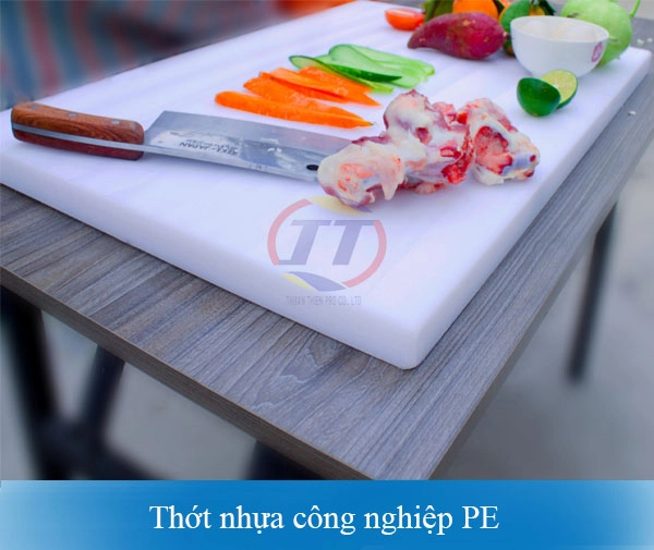 Thớt nhựa công nghiệp PE là sản phẩm được sản xuất từ chất liệu nhựa PE (polyetylen), nhẹ hơn gỗ, có khả năng chống ăn mòn, độ bền cao, thường được sử dụng tại các nhà hàng, khách sạn hoặc sử dụng trong căn bếp gia đình.