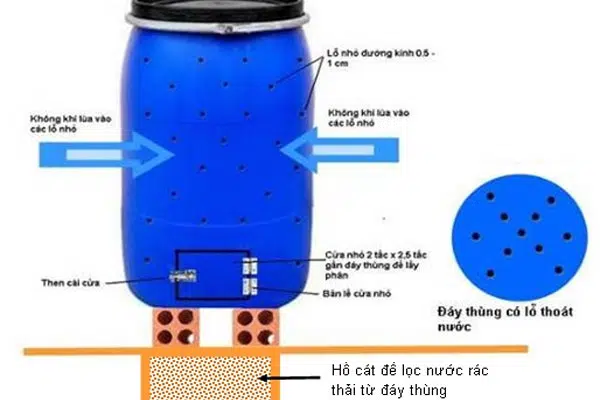 Trước tiên, cần vệ sinh thùng ủ rác sạch sẽ. Sau đó, dùng dao, kéo đục những lỗ tròn trên thân thùng. Những lỗ này nên cách nhau khoảng 10 – 15cm và đục đều từ trên xuống dưới. Tiếp đến, khoét 2 ô vuông ở 2 bên thân thùng, cố định bằng khóa chắc chắn với tác dụng lấy phân thành phẩm sau 20 – 30 ngày.