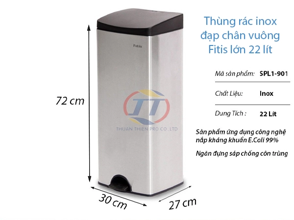Thùng rác inox đạp chân vuông Fitis có dung tích 22l lớn hơn cho người dùng thêm nhiều không gian để chứa rác. Sản phẩm này của nhà Fitis cũng được thiết kế với nhiều cải tiến như ứng dụng công nghệ nắp kháng khuẩn E.Coli 99%, đảm bảo hợp vệ sinh; công nghệ giảm chấn hiện đại cũng giúp quá trình đóng – mở nắp thùng dễ dàng hơn, hạn chế tình trạng nứt, vỡ do va chạm.
