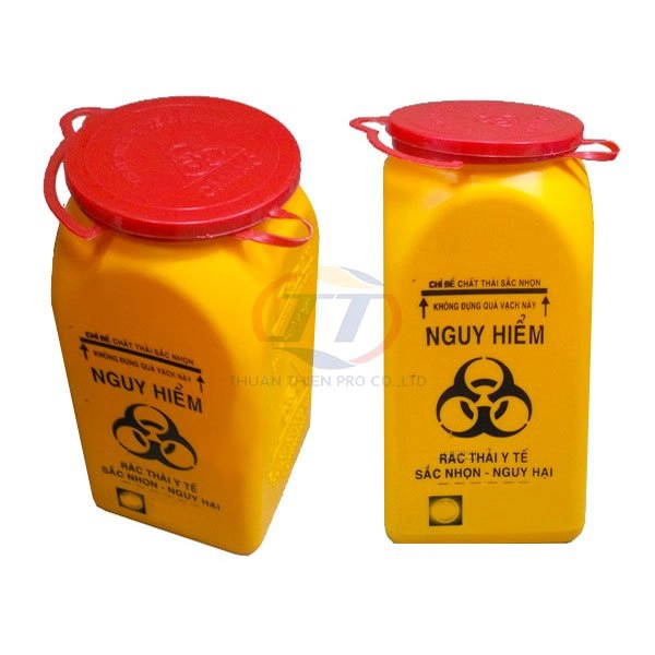 Được làm từ nhựa PP, hộp đựng kim tiêm có dung tích 1,5L, kích thước 95x95x190mm được các cơ sở khám chữa bệnh sử dụng. Sản phẩm được sản xuất đúng theo tiêu chuẩn của Bộ Y tế, màu vàng, nắp đỏ, trên thân hộp có dán logo chuẩn theo quy định.